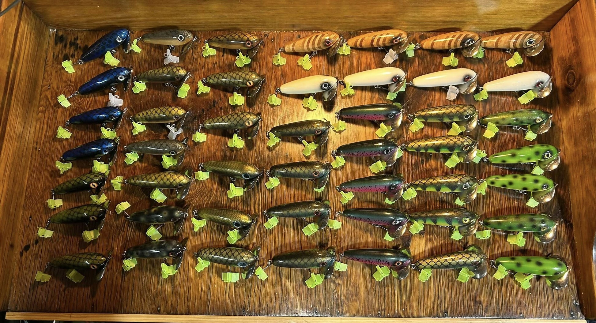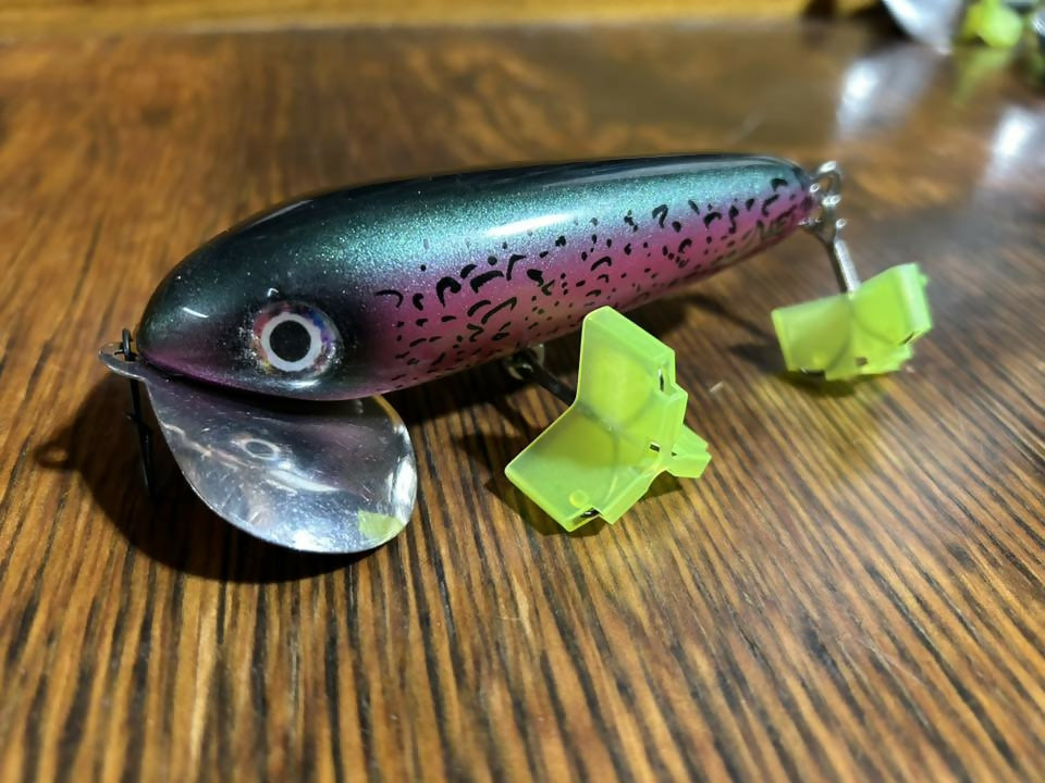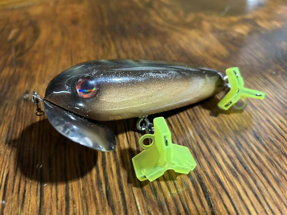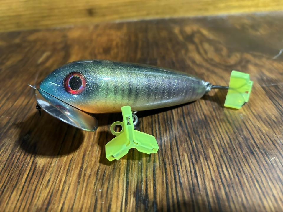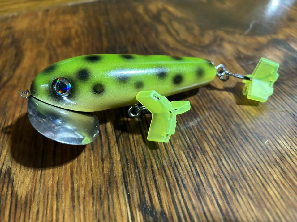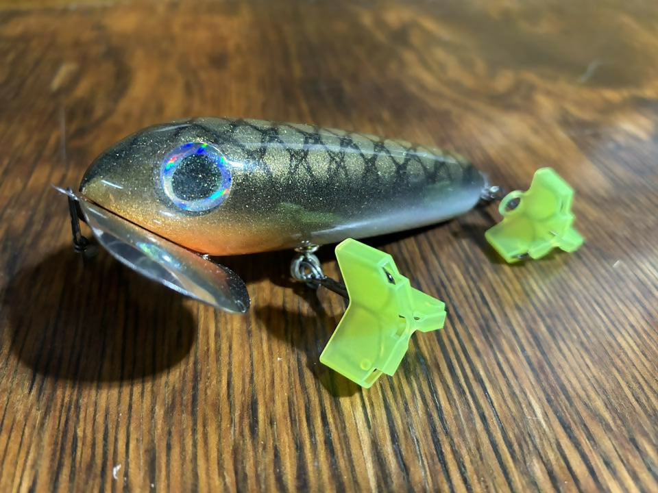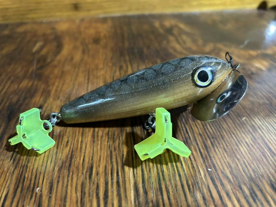 I call these SkitterWakes. My rendition of the OG musky bug. All made from wood, and very similar shape and construction to how the originals were made back in the old days. But better hook placement, hardware, and stainless lips, with heavier duty screws, and epoxy holding them on. I have been throwing these for years and put some great quality fish on these along with some friends. I have had a lot of hours behind an OG musky bug and I honestly think these have a more crisp and positive sound on the water than the originals with the aluminum lip.
