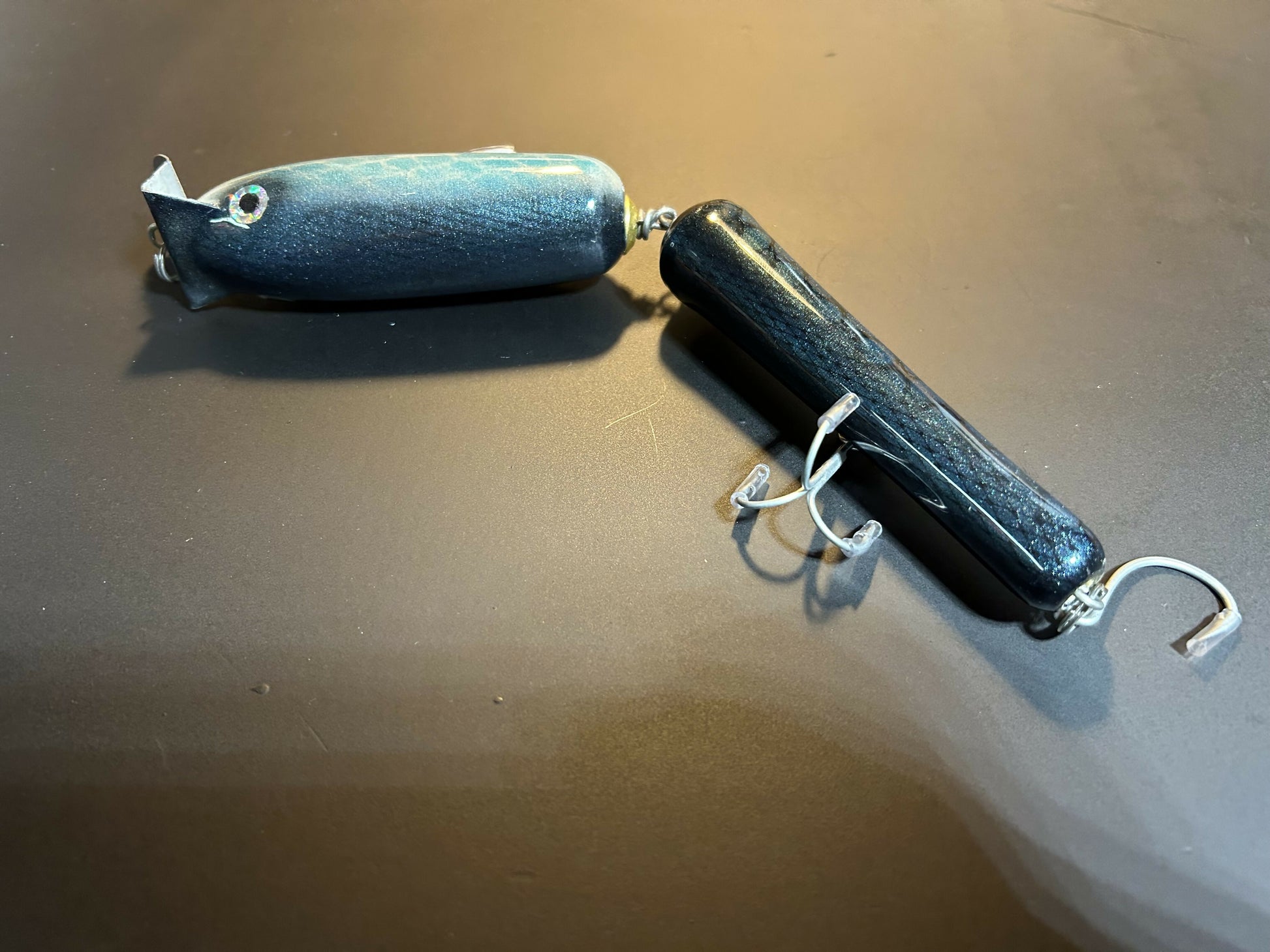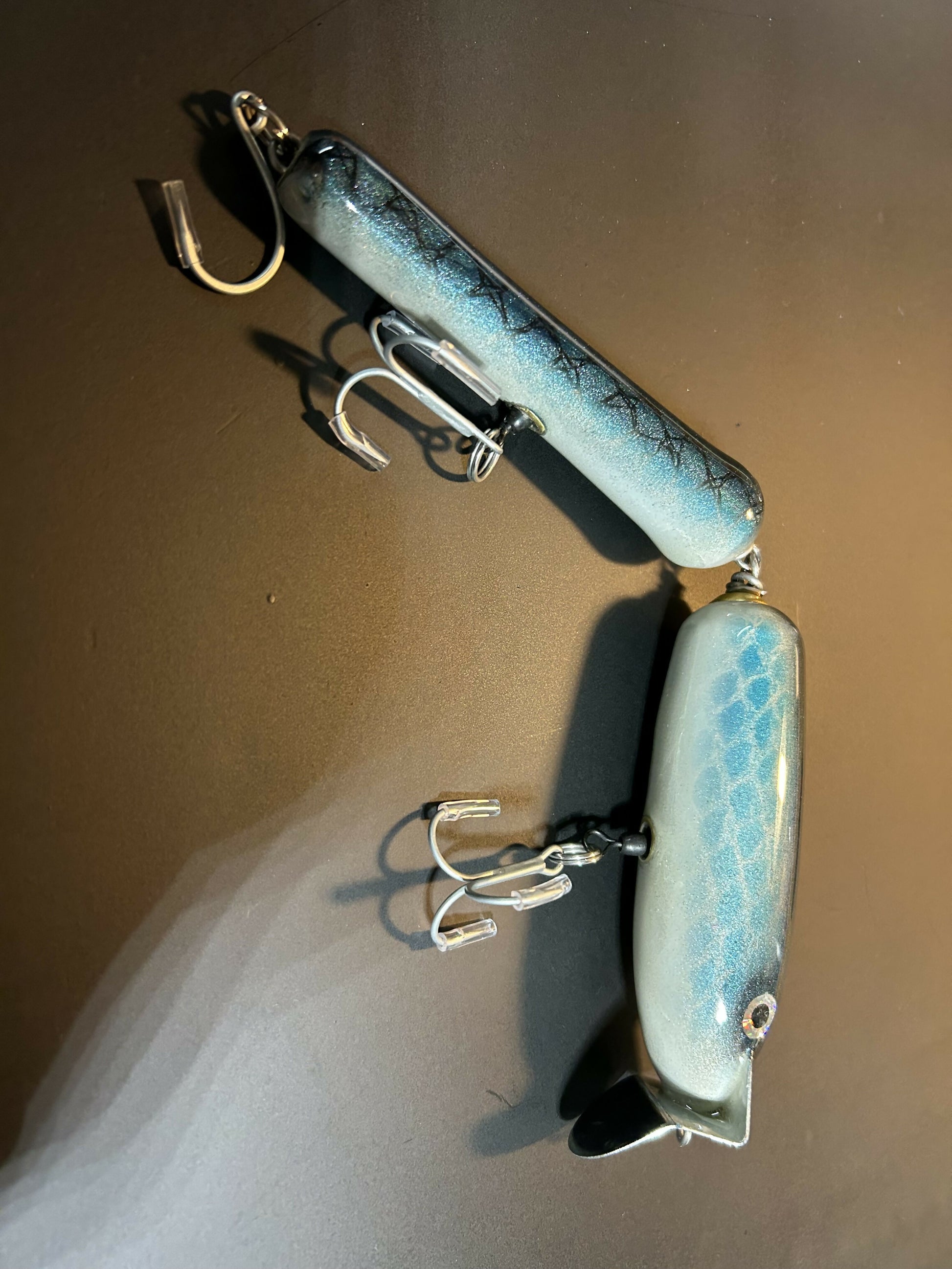 An exact replica of the original Gibbs Jointed GTS. This guy is all thru wired, made from sugar pine, and has 2 360lb rosco rotating hook hangers. Sporting some big 3/0 vmc 4x trebles, and inline.
