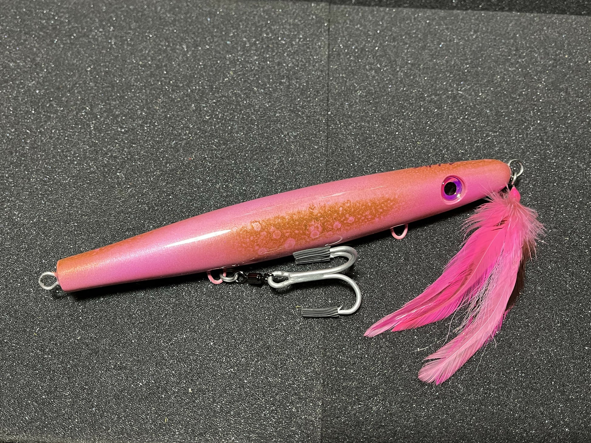 Solstice TBO Needle 8" x 3.5oz in Hank squid color is a slow/moderate large profile sinking needlefish. Slightly weighted to the tail. Comes with single hook 3/0 mustad 5x drop rig (recommended rigging for trophy hunting). This plug accounts for some of my largest caught striped bass season after season.